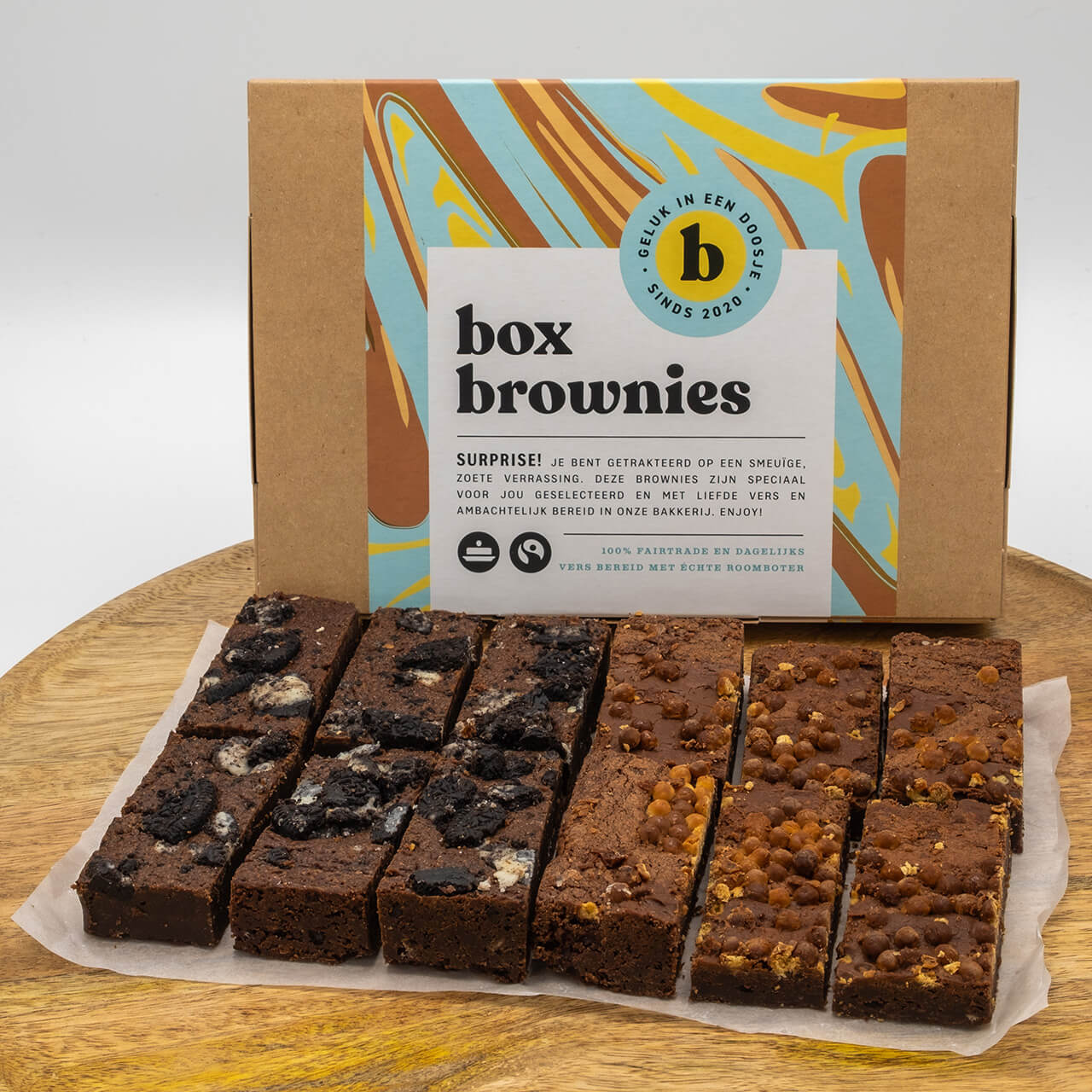Bij de levering geven wij in de verpakking het advies mee om de brownies eerst in de koelkast te bewaren voor stevige brownies en op kamertemperatuur voor zachte brownies.