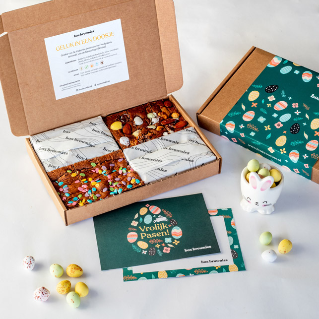 Ben je op zoek naar een leuk en smakelijk cadeau wat je kan geven voor Pasen? Kies een heerlijke Box Brownies in het paasthema. Je kunt zelfs gratis een kaartje aan de box toevoegen. Heb je geen tijd om langs te gaan? Kies de verzenddatum en wij bezorgen de brownies door de brievenbus. Blijf je liever thuis? Bestel dan een Paas High Tea box voor thuis. Deze box bevat heerlijke zoete en hartige hapjes, ideaal om samen met de familie van te genieten.