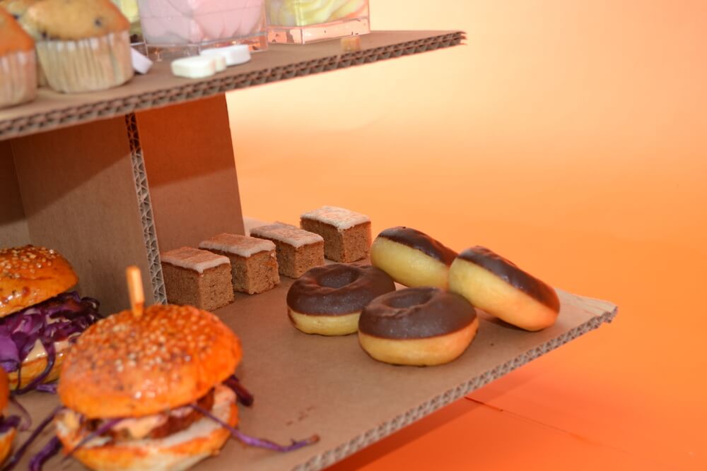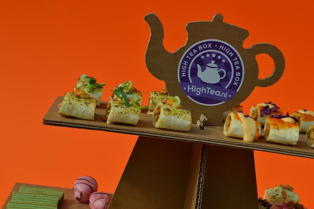High Tea box met belegde sandwiches, wraps, zoete hapjes en thee