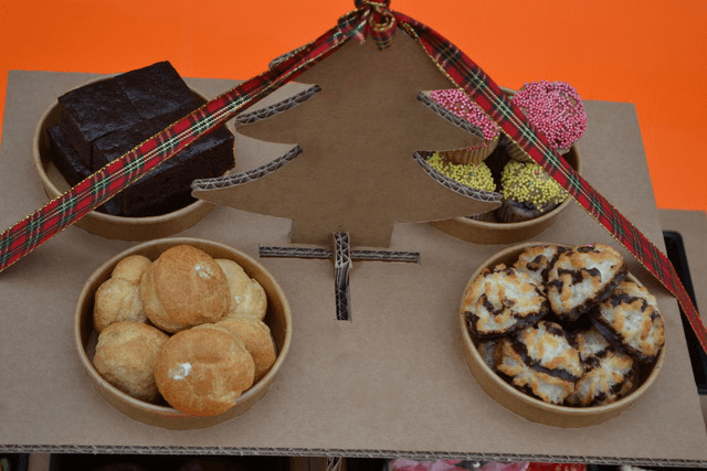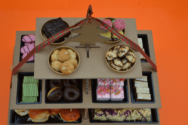 Kerst High Tea met belegde sandwiches, wraps, zoete hapjes en thee