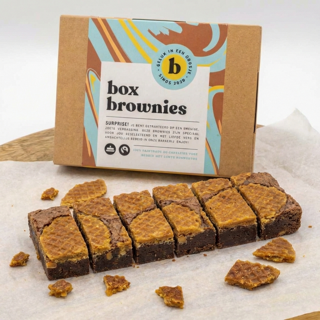 Ambachtelijke brownies gecombineerd met het bekendste Hollandse koekje: de stroopwafel. Deze smeuïge brownies van Box Brownies hebben de perfecte balans tussen zachte chocolade en knapperige stroopwafelstukjes.